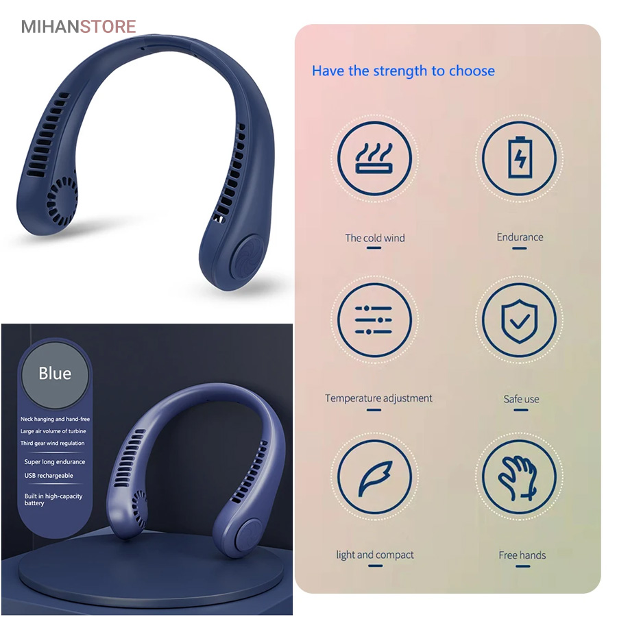 این پنکه همراه به وسیله شیارهای متعددی که روی بدنه خود دارد می‌تواند سر، صورت و گردن شما را خنک کند و شما را از یک هوای گرم نجات ببخشد. این فن راه اندازی سختی هم ندارد و به‌راحتی با فشردن تنها یک دکمه فعال خواهد شد. همان دکمه می‌تواند دما را برای شما کم و زیاد هم کند. سرعت این پنکه در سه حالت قابل تنظیم است که می‌توانید بنا به نیازتان و میزان گرما از  آن‌ها استفاده کنید. موتور این پنکه پر قدرت بوده و بی‌صدا است. این پنکه با اتصال سیم usb به یک شارژر شارژ میشود و نیازی به باطری با سیم همراه ندارد، از این رو شما می‌توانید از این پنکه گردنی همراه در هرمکانی که دوست دارید استفاده کنید. با توجه به جنس و وزن کم این محصول اصلا ضرری را به گردن شما متحمل نمی‌شود. این پنکه به راحتی با زاویه صورت قابل تنظیم است. از طرفی این پنکه بازوهای قابل انعطاف داشته و منعطف است. بنابراین اندازه دلخواه را می‌توانید به راحتی تنظیم کنید.