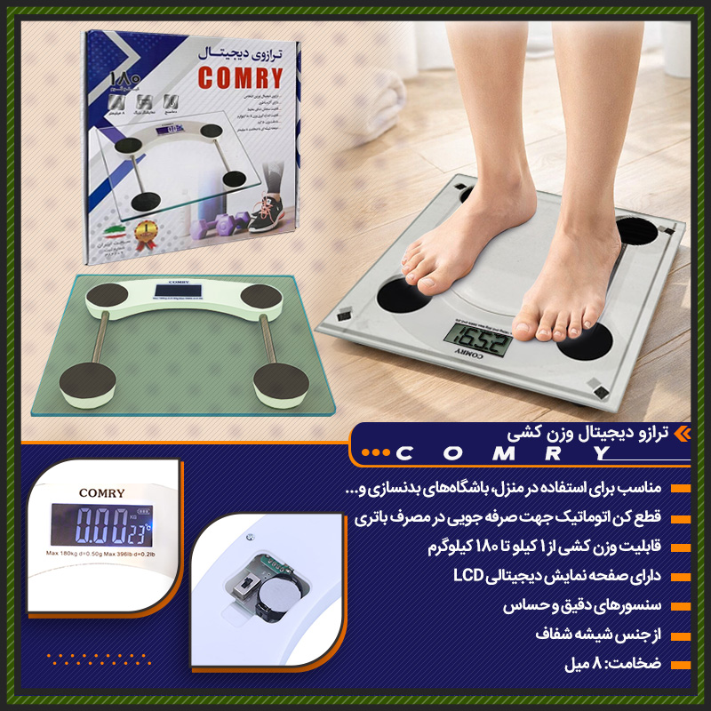 ترازو دیجیتال کومری شفاف از شیشه نشکن با ضخامت ۸ میلیمتر ساخته شدهاست. این ترازو دارای ظاهری ساده و مینیمال است و بر روی آن نمایشگر الایدی تعبیه شده و وزن شما را کاملا خوانا نمایش میدهد. چهار دایره مشکی رنگ بر روی بدنه شیشهای بیرنگ این ابزار، ظاهر آن را از یکنواختی خارج کردهاست. این ترازو از نوع جدید ترازو وزن کشی کومری هست که نسبت به سایر ترازو ها در بازار از دقت بسیار بالایی برخوردار هست.